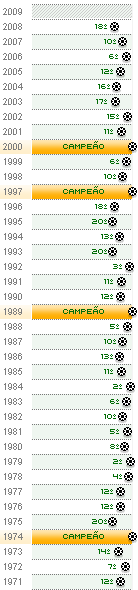 1923, 1924, 1929, 1934, 1936, 1945, 1947, 1949, 1950, 1952, 1956, 1958, 1970, 1977, 1982, 1987, 1988, 192, 1993, 1994, 1998 e 2003 |
