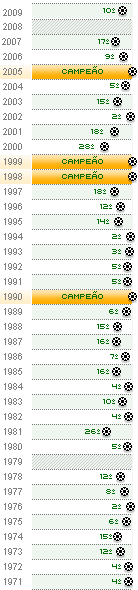 1914, 1916, 1922, 1923, 1924, 1928, 1929, 1930, 1937, 1938, 1939, 1941, 1951, 1952, 1954, 1977, 1979, 1982, 1983, 1988, 1995, 1997, 1999, 2001, 2003 e 2009 |